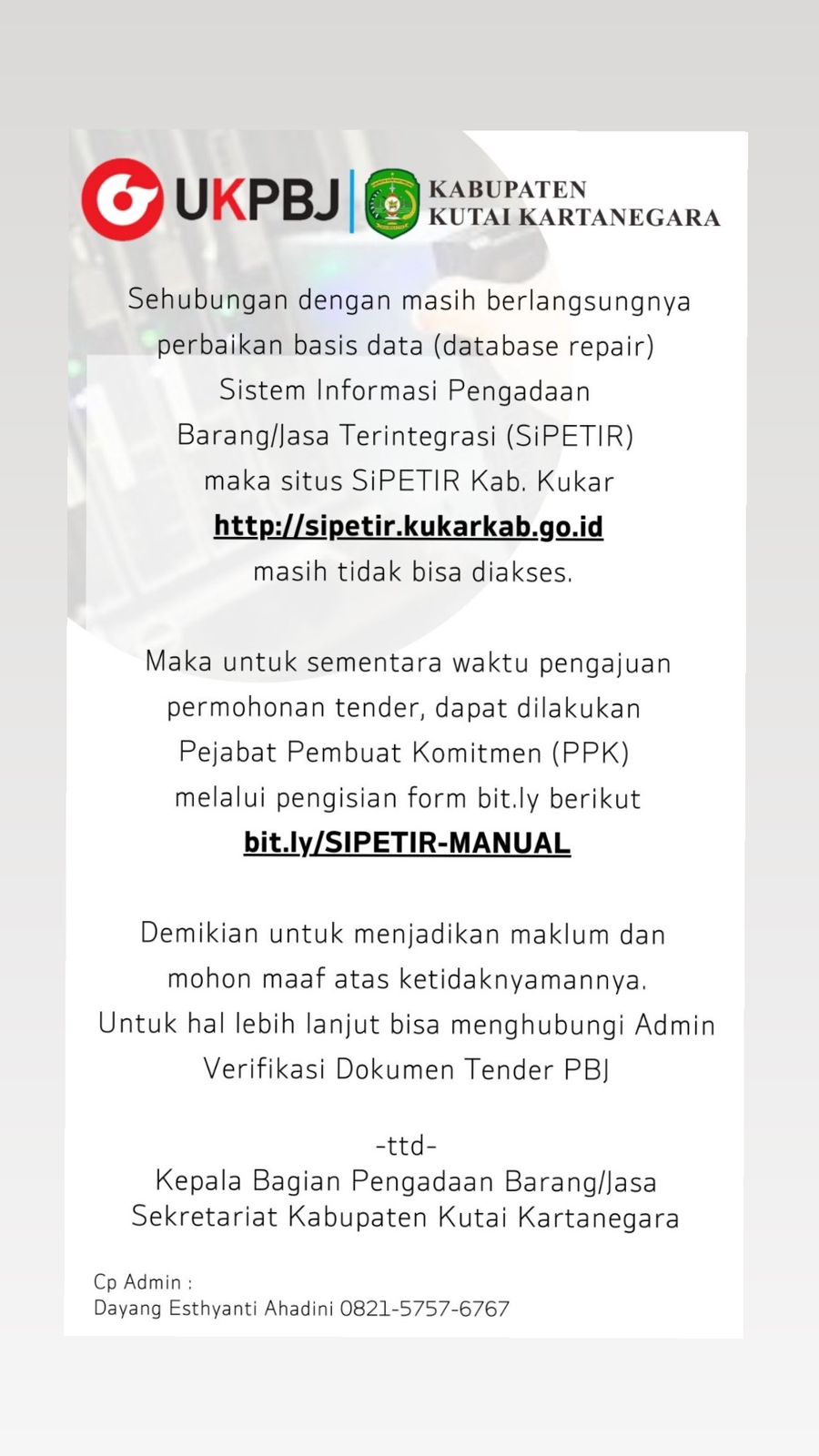 | Keterangan | Pemberitahuan Perbaikan Database Aplikasi Sistem Informasi Pengadaan Barang/Jasa Terintegrasi (SIPETIR) |