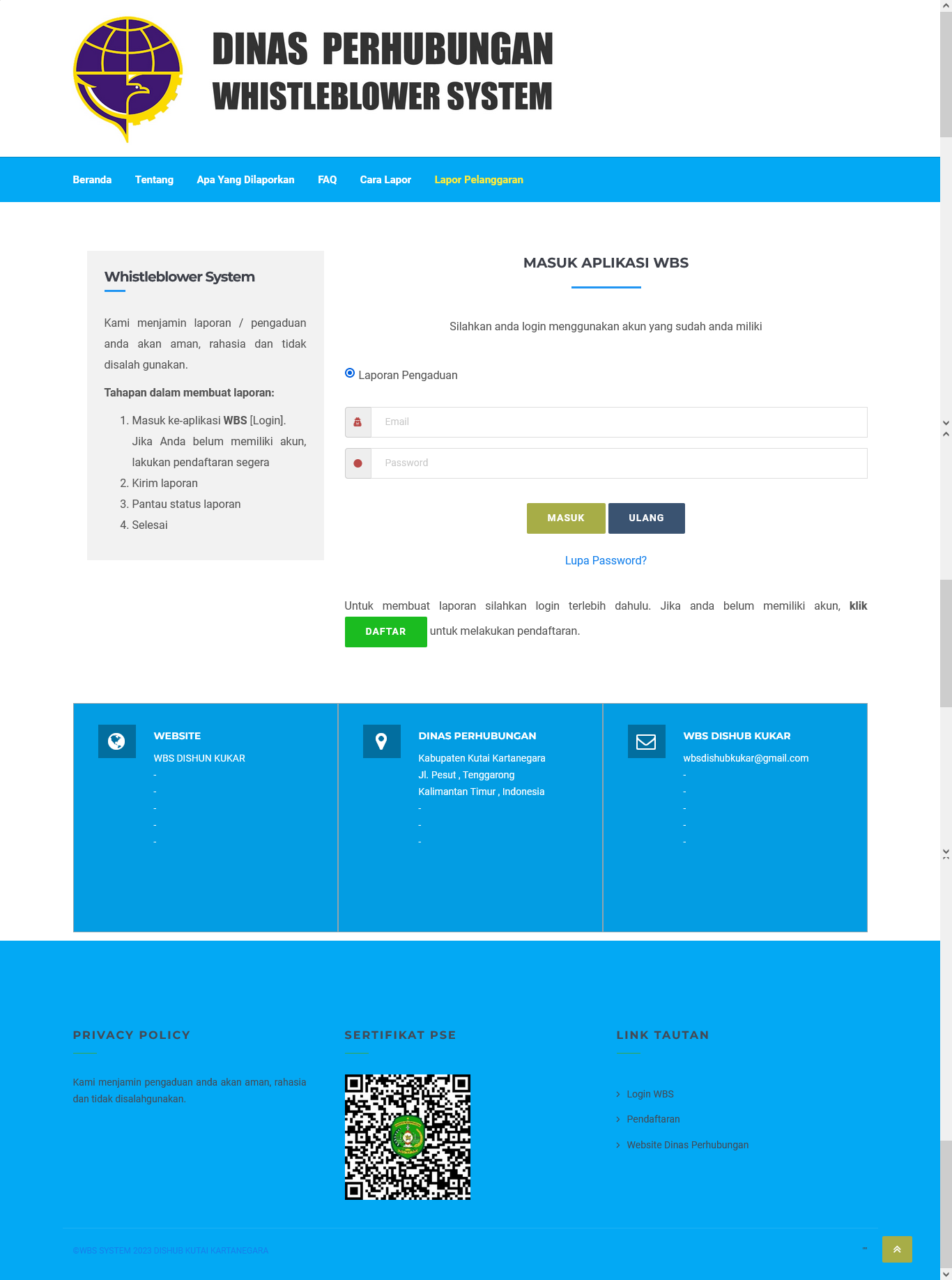 | Keterangan | Link Whistleblower Sistem Dinas Perhubungan Kutai Kartanegara : https://dishub.kukarkab.go.id/wbs/lapor/login-page |