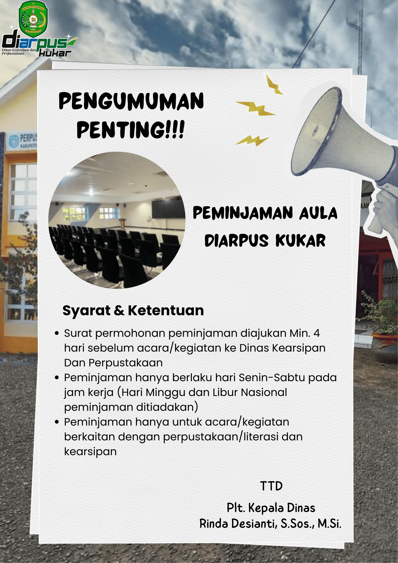 | Judul | PENGUMUMAN TENTANG PEMINJAMAN AULA DIARPUS KUTAI KARTANEGARA 2025 |