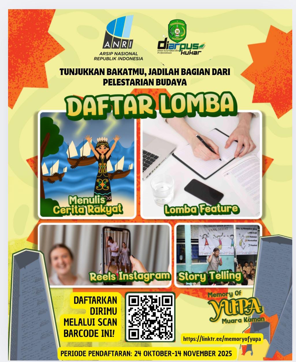 | Keterangan | Daftar Lomba Dalam Rangka Festival Of Yupa Muara Kaman antara lain 1. Menulis Cerita Rakyat 2. Lomba Feature 3. Reels Instagram 4. Story Telling Periode Pendaftaran : 24 Oktober s.d. 14 November 2025 Link Pendaftaran http://linktr.ee/memoryofyupa